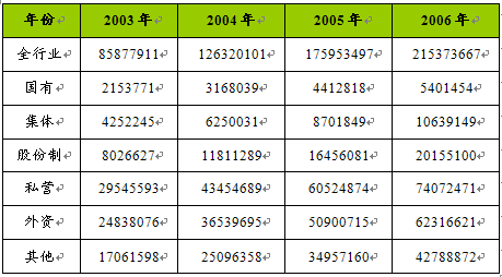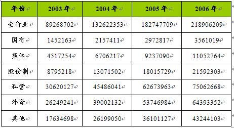 2003年-2006年涤纶纤维制造业不同所有制企业工业总产值 单位:千元