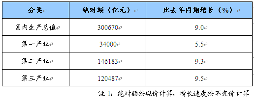 初步核算,全年国内生产总值300670亿元,比上年增长9.0%。分季度看,一季度增长10.6%,二季度增长10.1%,三季度增长9.0%,四季度增长6.8%。分产业看,第一产业增加值34000亿元,增长5.5%;第二产业增加值146183亿元,增长9.3%;第三产业增加值120487亿元,增长9.5%。