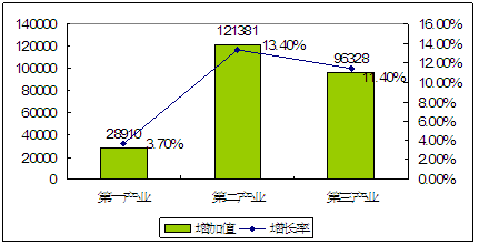 受世界经济快速增长和国内需求旺盛的拉动,全年国内生产总值246619亿元,比上年增长11.4%。分产业看,第一产业增加值28910亿元,增长3.7%;第二产业增加值121381亿元,增长13.4%;第三产业增加值96328亿元,增长11.4%。第一产业增加值占国内生产总值的比重为11.7%,与上年持平;第二产业增加值比重为49.2%,上升0.3个百分点;第三产业增加值比重为39.1%,下降0.3个百分点。分季度看,一季度增长11.1%,二季度增长11.9%,三季度增长11.5%,四季度增长11.2%。
