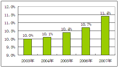 从2003年开始,我国经济增长率一直在10%平台上加速。2003年的增长率为10.0%,2004年为10.1%,2005年为10.4%。2006年我国GDP为209407亿元,增长10.7%,增速比上年加快0.3个百分点,2007年中国经济增长11.4%,是14年来的最大增幅。