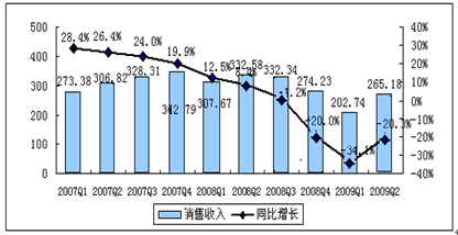 2009年上半年中国集成电路产量为192.44亿块,同比下降了19.1%。全 行业 共实现销售收入467.92亿元。同比下降了26.9%。其中二季度产业实现销售收入265.18亿元,增幅由一季度的-34.1%收窄至-20.3%,环比则比一季度大幅增长30.8%,表明国内集成电路产业正在逐步走出低谷。
