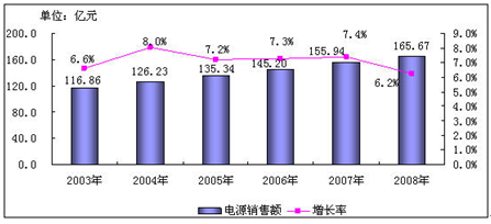 2008年中国电源市场销售额165.67亿元,同比增长6.2%,受全球金融危机影响,电源市场销售额增长率在近几年中首次出现下滑。自2003年以来,随着各 行业 信息化建设的不断深入,中国电源市场一直处于稳定发展态势。2008年中国电源产品产量3163万台,同比增长5.7%。
