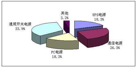 通用开关电源、通信电源、UPS和PC电源是电源领域的主要细分市场。2008年,通用开关电源实现销售额56.2亿元,占据33.9%的市场份额,通信电源市场占26.3%,而UPS市场占18.3%。随着通信电源、UPS市场的快速增长,其在电源产品整体市场中的份额也在逐步扩大。