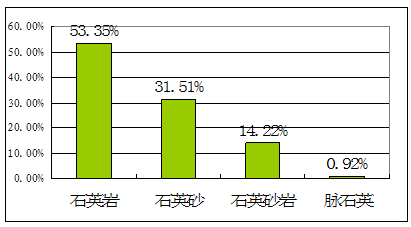 我国大陆有玻璃硅质原料产地199处,累计探明储量42.94亿吨,其中A+B+C级11.74亿吨;保有储量41.74亿吨,其中A+B+C级10.42亿吨。在保有储最中,以石英岩储量最多,为22.27亿吨,占53.35%;石英砂次之,为13.15亿吨,占31.51%;石英砂岩第三,为5.94亿吨,占14.22%;脉石英最少,为0.38亿吨,仅占0.92%。