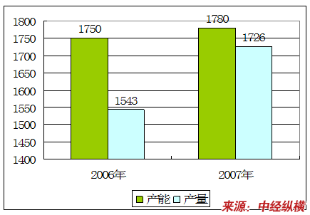 2006-2007年我国纯碱产能与产量对比 单位:万吨