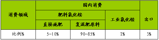 在我国,95%以上的氯化铵作为氮肥施用,少量用于工业原料。近年来工业氯化铵价格较高,出口占50-60%,部分企业都有扩建工业氯化铵能力的打算,但由于国内外对工业氯化铵的总需求数量有限,不可能超过国内产量的5%,因此,氯化铵的市场主要集中在氮肥领域。