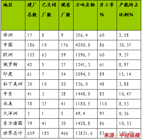 世界各地区尿素生产装置和能力分布情况