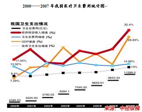 从2003-2007年,中国财政用于医疗卫生的支出累计6294亿元,比前5年增长了1.27倍。2007年政府卫生支出增长明显。相比2006年政府卫生支出1778.86亿元(其中“公费医疗”部分为374.6亿元),2007年政府卫生支出达到2271.7亿元,增幅为28.83%(按卫生总费用中政府支出所占比重计算,含卫生事业费、预算内基本建设经费、医学科研经费、公费医疗等支出)。