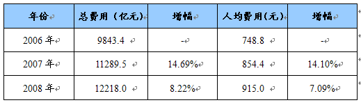 2007-2008年,全国卫生总费用仍呈上升趋势。相比2006年,已经核算出的2007年全国卫生总费用达11289.5亿元,增加1446.1亿元;人均卫生费用854.4元。而2008年的全国卫生总费用将达到12218亿元,人均卫生费用915元。