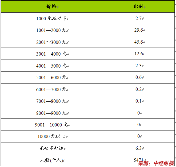 从城市居民家庭对电冰箱的预期购买价格情况来看:约有45.0%预期购买电冰箱的家庭希望购买产品的价位在2000—3000元。