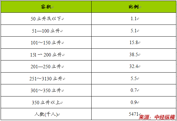 从电冰箱的使用容积来看:使用180L以下容积电冰箱的家庭约占拥有电冰箱家庭的47.3%;使用180L—250L容积电冰箱的家庭约占拥有电冰箱家庭的49.2%;使用250L以上容积电冰箱的家庭约占拥有电冰箱家庭的3.5%。