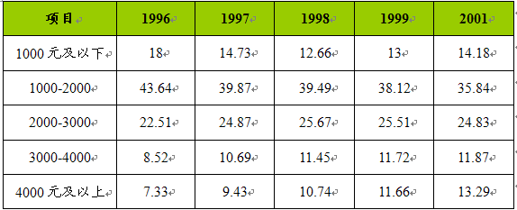 二是温饱向小康过渡型消费,人均年收入在2000-3000元的家庭,比重为25%左右。对日常消费品、生产资料以及家电产品的需求上,已开始对品种、质量、品牌、档次表现出明显的关注,但要实现消费能力的升级,还需要一定时期的积累,在预期收入不高的情况下,即期消费能力受到抑制,这部分地区主要集中在中部大部分地区、东部和西部部分地区。三是小康型消费,人均年收入在3000元以上的家庭,占调查家庭总数的25%左右。小康型家庭多分布在东部大部分地区、中部小部分地区、西部少数地区,这部分家庭整体生活已步入小康。由于其手持现金和存款已具有满足消费意愿的能力,因此传统的生活消费品基本饱和,特别是住房消费大多已经完成,消费热点已开始向家电产品转移,消费结构的升级愿望强烈,消费观念明显趋向城市化。