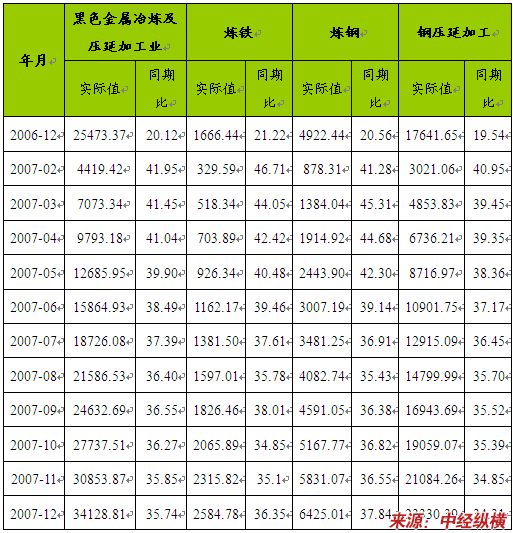 2007年我国粗钢产量不仅全球第一,且产量超过第二到第八的总和,占全球总产量的36.4%,2006年这一比例为33.8%,2005年为31%,2004年为26.2%,呈现逐年递增趋势。值得关注的是,全球粗钢产量增速开始减缓,全球7.5%的增速低于2006年的8.8%,其中,我国增速15.7%也低于2006年的18.8%以及2005年的26.8%,但中国的钢产量增长仍是健康的。