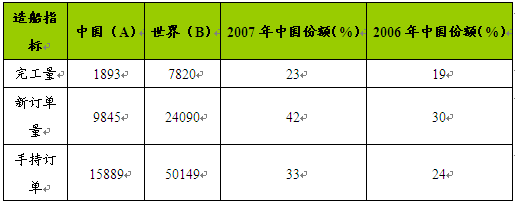 据船舶工业统计快报数据,2007年全国造船完工量1893万载重吨,比上年增长30%;新承接船舶订单9845万载重吨,比上年增长132%;手持船舶订单15889万载重吨,比上年增长131%。