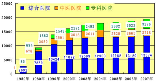 2007年底,全国卫生机构数达31.5万个,其中:医院19900个、卫生院4.0万个、社区卫生服务中心(站)2.4万个、妇幼保健院(所、站)3007个。与2003年比较,卫生机构增加2.4万个,其中:社区卫生服务中心(站)、卫生监督机构和医院有所增加,妇幼保健机构和疾病预防控制机构变动不大,乡镇卫生院随着乡镇调整继续减少。