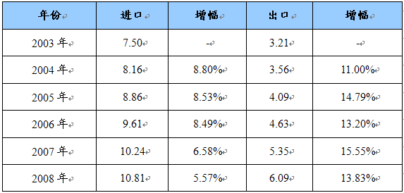 2003-2008年我国倍绣生物蛋白胶进出口量统计 单位:万套