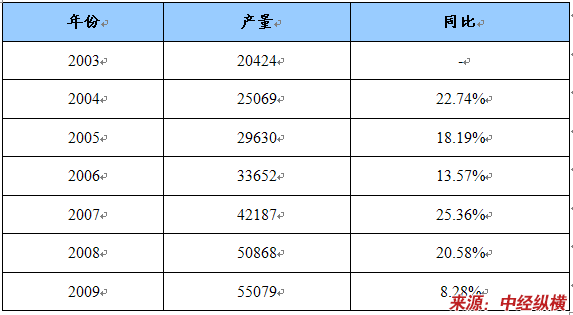 2003-2009年蛋粉产品产量及同比增长统计表 单位:吨