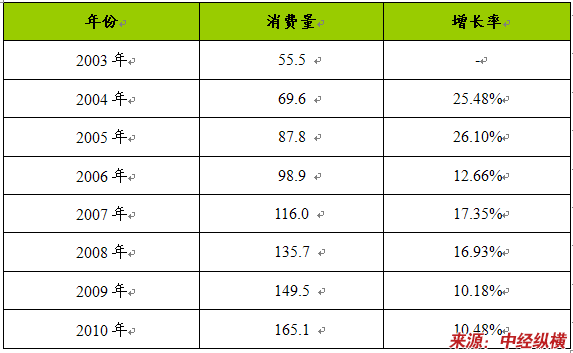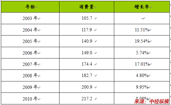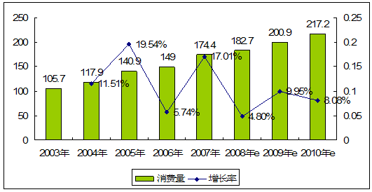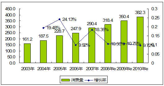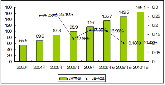2003-2007年我国彩色涤纶短纤维产品消费量
