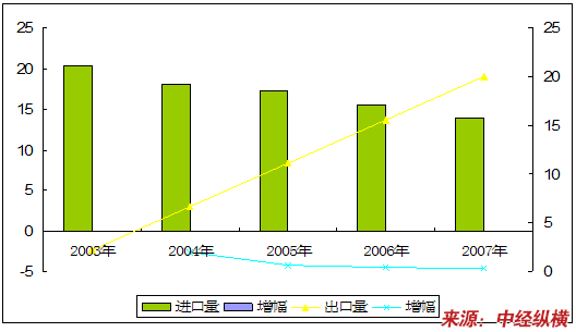 2003-2007年我国彩色涤纶丝产品进出口统计图 单位:万吨