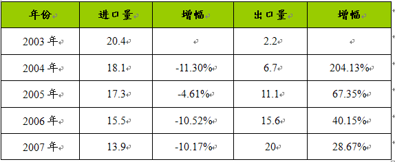 2003-2007年我国彩色涤纶丝产品进出口统计表 单位:万吨