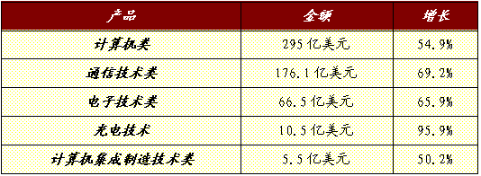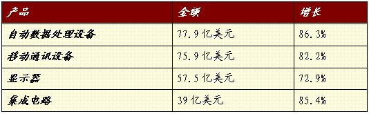 从主要产品来看,自动数据处理设备、移动通讯设备、显示器、集成电路等重点高新技术产品出口增长迅猛,分别达到77.9亿美元、75.9亿美元、57.5亿美元和39亿美元,分别增长86.3%、82.2%、72.9%和85.4%,均高于高新技术产品出口整体增幅;其中,笔记本电脑、液晶显示器和手机分别增长1.1倍、1.1倍和1倍。此外,高端彩电出口增长迅猛,其中液晶彩电出口88.8万台(去年同期46.6万台),出口额1.62亿美元(去年同期0.29亿美元);等离子彩电出口2.71万台(去年同期35台),出口额由7.4万美元增长到4830万美元。