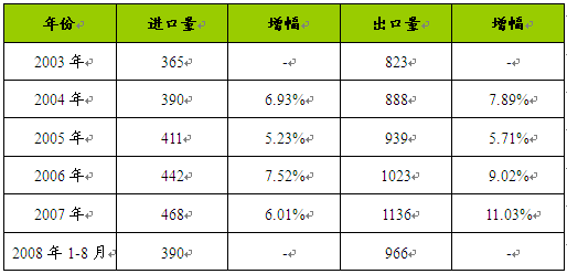 2003年我国电线电缆油膏的进口量为365吨,出口量为823吨,2004年进口量为390吨,出口量为888吨,同比分别增长了6.93%、7.89%。2006年进口量增幅为7.52%、出口量增幅为9.02%,到2007年进出口量分别为468、1136吨,进出口量比上年分别上涨了6.01%、11.03%。