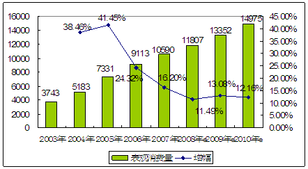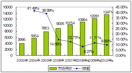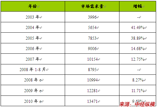 我国电线电缆油膏的市场需求量及增长率发展较快,2003年我国电线电缆油膏的市场需求为3996吨,2004年市场需求量为5654吨,比上年增长了41.49%,2005年市场需求为7853吨,比上年增长了38.89%。国家“十一五”电力 行业 发展 规划 中对未来几年电力 行业 发展投资的 规划 ,使得我国电力 行业 包扩相关制造 行业 的市场需求增速有所下降,2006年我国电线电缆油膏的市场需求增长速度下降到14.68%,2007年市场需求为10154吨。增幅下降到12.75%。受金融危机的影响,2008年下半年市场需求增速出现下滑,全年市场需求增速下降到8.27%,而预计2009年、2010年随着我国下游市场对电线电缆油膏需求的增加,市场需求将逐渐恢复,但增长速度相比前几年缓慢,到2010年市场需求达到13471吨。