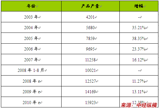 2003—2010年电线电缆油膏产品产量 分析 及预测表