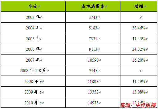 从我国电线电缆油膏的表观消费量来看,近几年来增长速度很快。2003年我国电线电缆油膏的表观消费量为3743吨,2004年增加到5183吨,比上年增长了38.46%,2005年表观消费为7331吨,2006、2007年分别为9113、10590吨。从2006年开始消费增幅速度有所减缓,主要是“十一五”电力电缆 行业 发展 规划 所引起的。预计2008年表观消费量为11807吨,增幅下降到11.49%,其主要原因是金融危机的影响使得市场需求、企业产量都受到了很大的影响。而未来几年电线电缆油膏表观消费的增长速度将有所减缓,预计到2010年我国电线电缆油膏的表观消费量为14975吨。