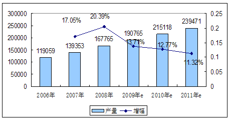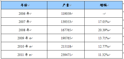 2006-2011年我国PCD金刚石刀具产量增长趋势 单位:把