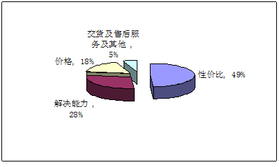 可以看出,寿命与价格因素占到60%,各刀具供应商对性价比的定位非常重要,将直接影响销售大局;与服务相关的三项因素(售服+供货+快捷服务)约占28%,表明刀具使用者对服务依赖性较大。品牌因素约占9%左右,同样不时忽视,我们认为以现在刀具市场的竞争环境,致力于对品牌的提升将会很大程度扩大市场份额及本公司的市场稳定。