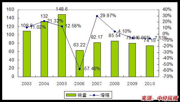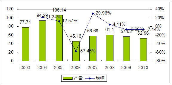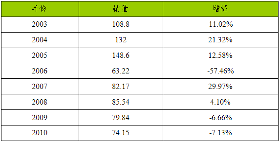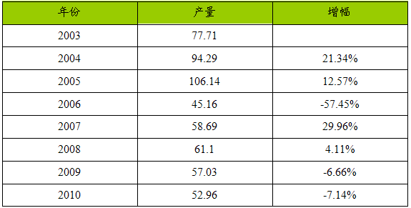 2003—2010年针式打印头产品产量 分析 及预测表