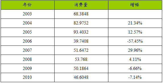 2003—2010年针式打印头产品消费量 分析 及预测表