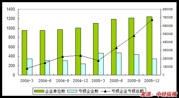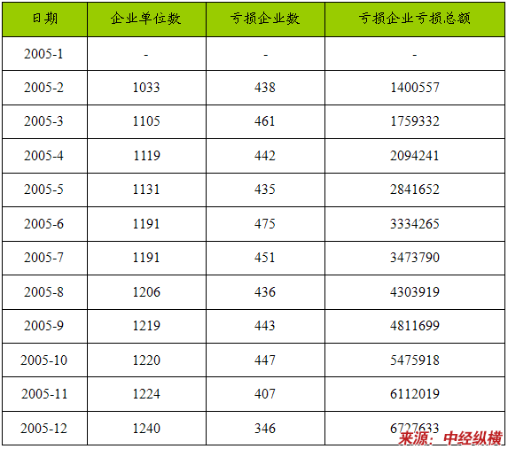 2005年1-12月生产企业单位数、亏损企业数、亏损企业亏损总额月度数据