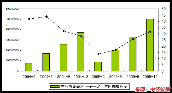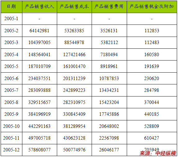 2005年1-12月产品销售收入、销售成本、销售费用、销售税金及附加月度数据