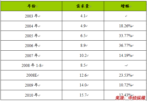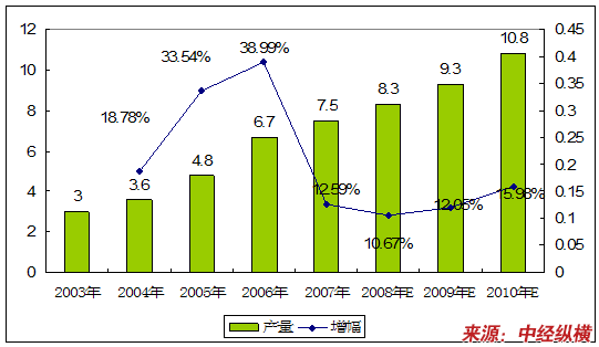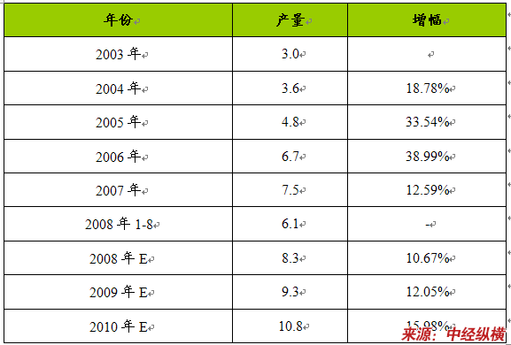 2007年国内灯饰玻璃供应能力8-10万吨,实际产量达到7.5万吨,但是市场需求量超过10万吨。近年来,我国灯饰玻璃需求量迅速增加,尤其是2006年下半年,灯饰玻璃需求量激增,达到月需求4000吨以上,2008年1-8月,国内灯饰玻璃产业更是迅速发展,产量达到6.1万吨,预计2008年我国灯饰玻璃产量可以达到8.3万吨,较2007年增长10.67%。