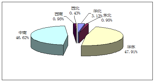 综合灯饰生产企业分布情况可以得知,我国灯饰玻璃消费的主要地区为中南地区及华东地区,占全国消费的94.12%。