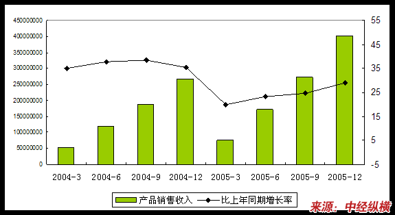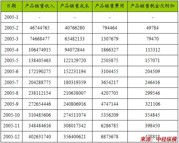 2005年1-12月产品销售收入、销售成本、销售费用、销售税金及附加月度数据