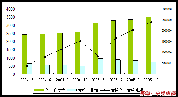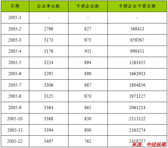 2005年1-12月生产企业单位数、亏损企业数、亏损企业亏损总额月度数据