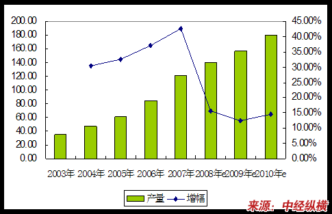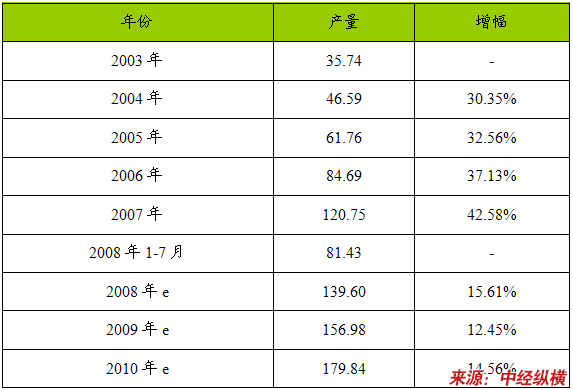 2003-2007年我国票据打印机产量以超过30%的增长率迅速增长,2008年1-7月我国票据打印机产量达到81.43万台,2008年我国票据打印机受全球经济放缓的影响,产品产量仍然持续增长,但增长率有所降低,到2010年我国票据打印机产量将达到179.84万台。