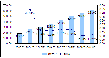 注:对我国电摩电机市场未来两年的消费走势以及消费的市场增长率的预测主要是通过线性回归的方法进行预测,预测的公式模型为y=a+bx,y为因变量,x为自变量,a为常数项,b为回归系数。该模型是根据两个变量x、y现有的统计数据(即我国电摩电机的5年的消费数据)来寻求常数项a和回归系数b的合理值来确定回归方程,然后再利用已求出的回归方程中的经验值并与相关条件结合来确定x,y等值的未来值。