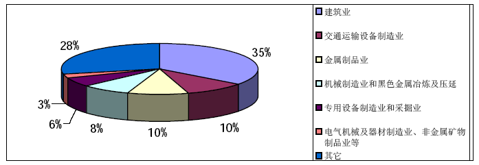 从目前中国钢铁产品消费的 行业 结构看:建筑业是大头,占35.2%;交通运输设备制造业和金属制品业各占10%左右;普通机械制造业和黑色金属冶炼及压延加工业占8%左右;专用设备制造业和采掘业占6%左右;电气机械及器材制造业、非金属矿物制品业等占2%至3%。