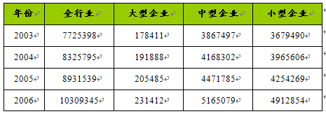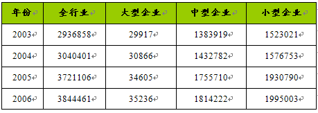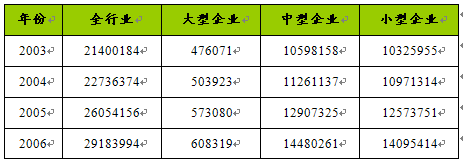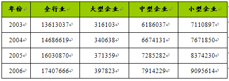 2003年-2006年日用玻璃制品及玻璃包装容器制造业不同规模企业资产规模 单位:千元