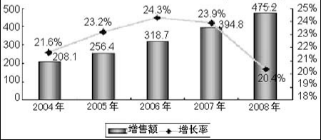 2004~2008年中国网络设备整体市场规模预测(亿元)