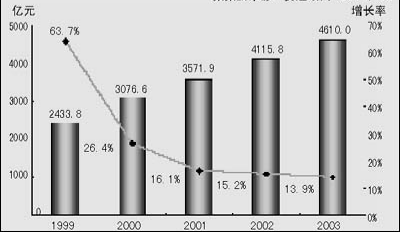 2003年,中国无线市话设备的市场规模为348亿元,用户数为3605万,比2002年底的1320万增长173.1%。