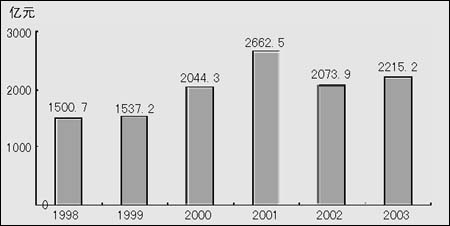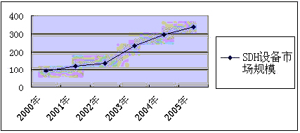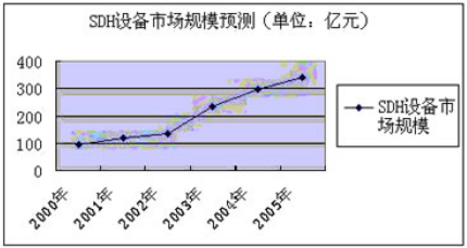 由于我国通信业的发展,SDH设备的市场规模也在持续增长。1998年市场规模超过38亿元,2001年则达到了120亿元。2002年是与2001年持平且略有增加。根据这种发展趋势并且考虑多种因素影响,预计到2005年,SDH光传输设备市场的规模将达到338亿元。