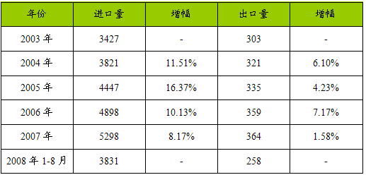 2003年我国液压打包机的产量为8178台,到2007年年底产量增长到12814台,比2003年增长了56.68%;2003年我国液压打包机的需求量为13630台,2007年需求量为23508台,比2003年增长了72.47%。从近几年的产量和需求量的比较来看,目前我国液压打包机 行业 处于供不应求状态。因此每年我国都有大量的产品需要从国外进口,2003年我国液压打包机的进口量为3427台,2007年进口量为5298台,比2003年增长了54.59%。而近年来我国液压打包机的出口量则较小,其产品主要出口非洲、东南亚等地区。