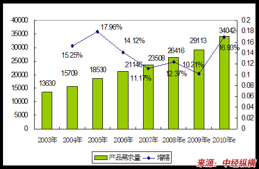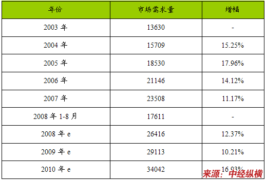 随着液压打包机应用范围的扩大及性能的提高,市场上对其需求增长较快,自2003年以来我国液压打包机的市场需求均以10%以上的速度增长,2003年我国液压打包机的市场需求为13630台,2004年为15709台,比上年增长15.25%,2005年产量为18530台,比上年增长17.96%,达到历年来最高增长水平,2006年、2007年的产量和增长率分别为21146、23508和14.12%、11.17%。预计液压打包机市场将进一步扩大,未来几年市场需求增长率仍以10%以上的速度增加,到2010年,市场需求将达到34042台。