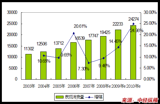 2003年-2007年我国液压打包机市场处于明显的供不应求状态,从产品表观消费量来看,2003年我国液压打包机的表观消费量为11302台,2007年为17747台,比2003年增加了6445台,增长率为57.02%,而相应的市场需求增加了72.47%,2003-2007年的年市场需求量均大于表观消费量。预计2010年我国液压打包机的表观消费量将为24274台,增长率为24.96%。市场依然处于供不应求状态。