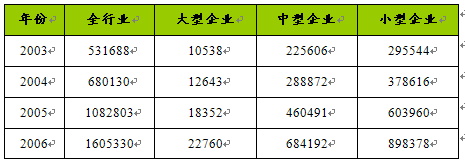 2003-2006年日用玻璃制品及玻璃包装容器制造业不同规模企业利润总额比较 单位:千元